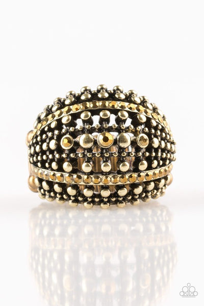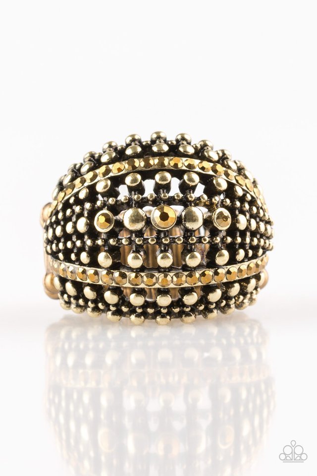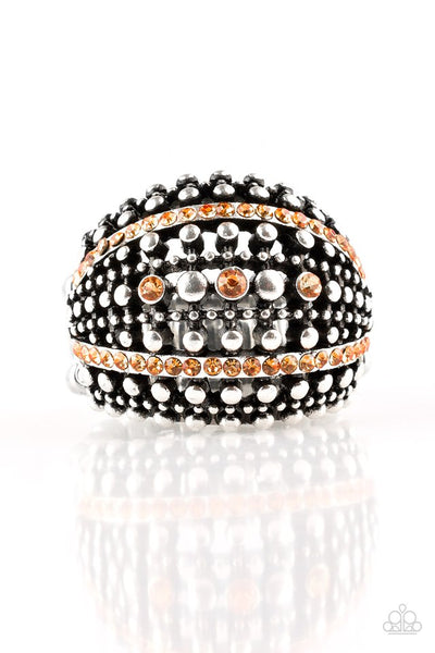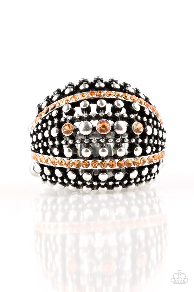 Varying in size, shimmery silver studs and glittery orange rhinestones join across the finger, coalescing into a bold industrial frame. Features a stretchy band for a flexible fit. Paparazzi Accessories