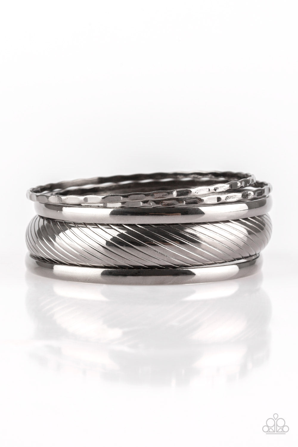 Featuring serrated and smooth surfaces, mismatched shiny copper bangles stack across the wrist for a casual look. Paparazzi Accessories