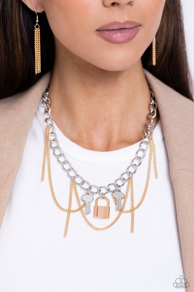 Mismatched silver chains layer down the chest. Featuring a high-metallic sheen, two key charms and a silver lock charm dangle from the upper-most chain while solitaire strands of silver chain sporadically swing and loop through the display, infusing the design with grungy movement. Features an adjustable clasp closure.