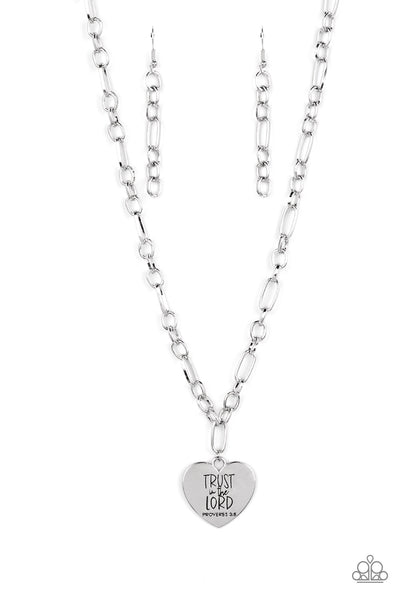 Dangling from a silver figaro chain, a charming heart pendant swings. Stamped upon the shiny surface, the phrase "Trust in the Lord" with the bible reference listed below it "Proverbs 3:5" are listed in different fonts for an optimistic and hopeful finish. Features an adjustable clasp closure.