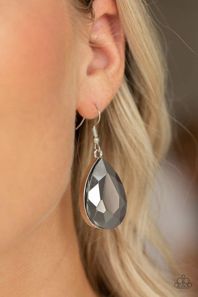 An oversized white teardrop rhinestone is nestled inside of a sleek silver frame for a dramatic look. Earring attaches to a standard fishhook fitting.