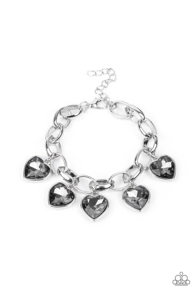 Smoky heart-shaped gems are encased in sleek silver frames that swing from an oversized silver chain, creating a sparkly fringe around the wrist. Features an adjustable clasp closure.