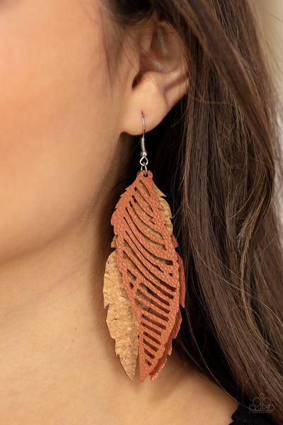 A mismatched collection of cork and brown leather feather frames flutter from the ear, layering into a free-spirited lure. Earring attaches to a standard fishhook fitting.