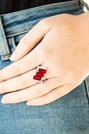 Nestled between two dazzling white rhinestone encrusted silver fittings, three emerald cut red rhinestone slant across the finger for a glamorous look. Features a dainty stretchy band for a flexible fit.