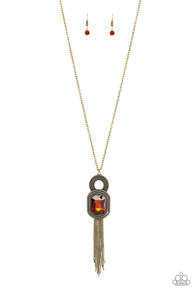 A regal gem is pressed into the center of an antiqued brass pendant radiating with ornate detail. Rounded brass snake chains stream from the bottom of the heirloom inspired pendant for a vintage finish. Features an adjustable clasp closure.