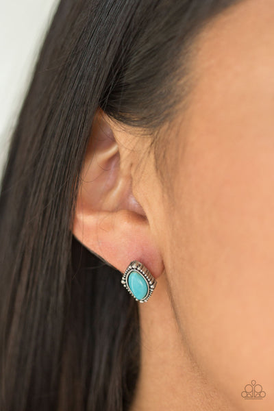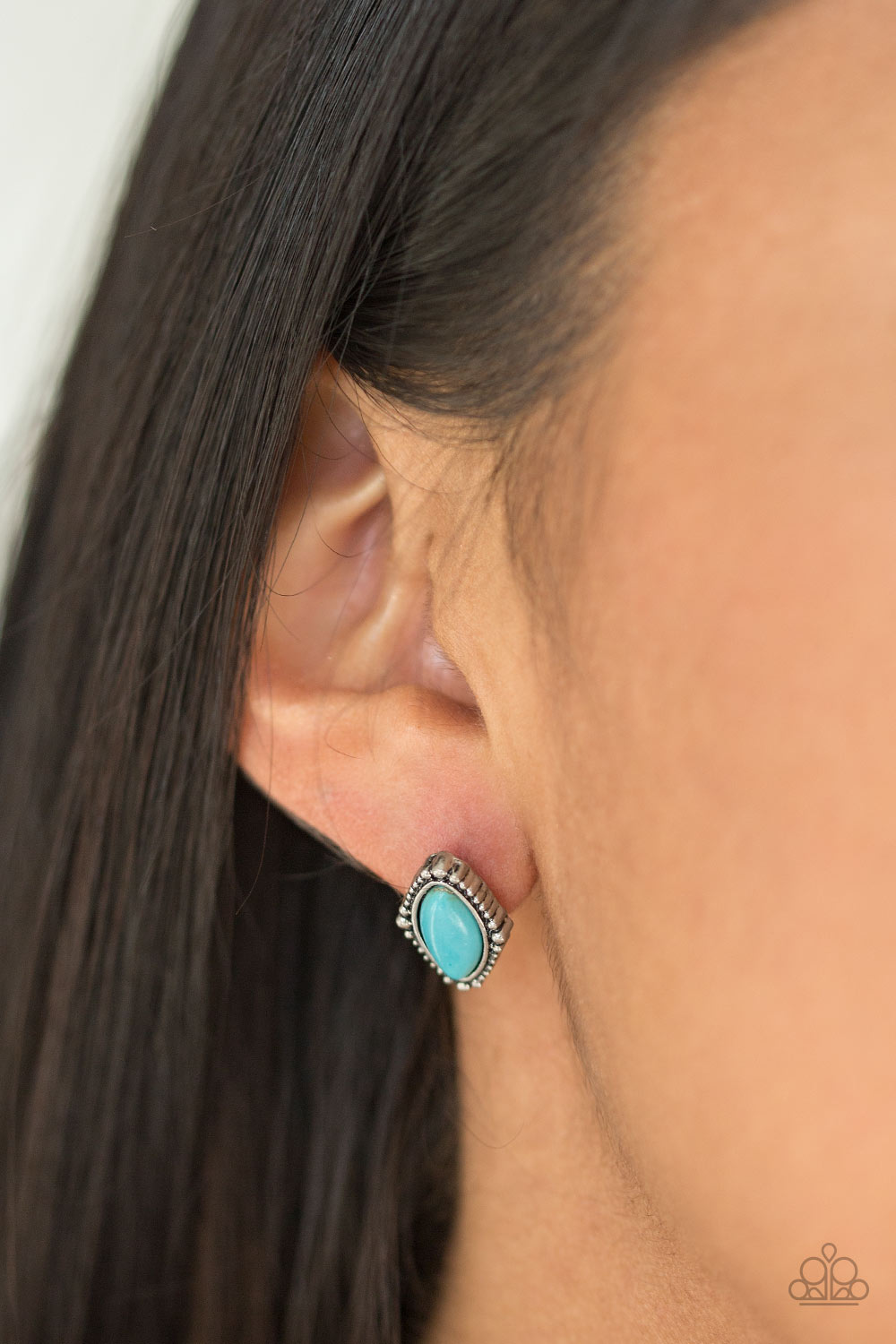 Chiseled into a tranquil marquise shape, a refreshing turquoise stone is pressed into a studded silver frame for a seasonal look. Earring attaches to a standard post fitting.
