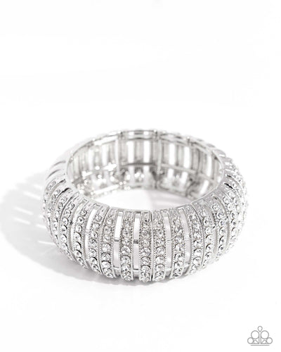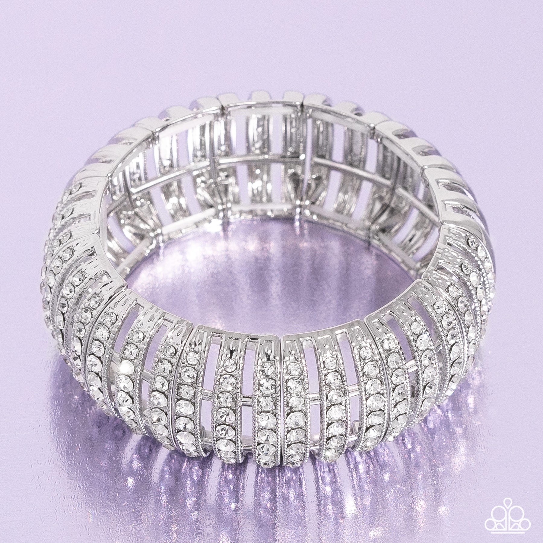 Featuring glistening white gems, trios of curved silver bars join high-sheen curved silver bars for a radiant, light-catching display around the wrist on elastic stretchy bands.
