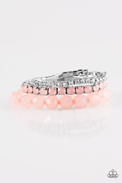 An array of faceted black beads, cloudy rhinestones, and glittery white rhinestones are threaded along elastic stretchy bands, creating a scattered mishmash of refined bracelets across the wrist.
