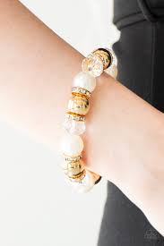 Oversized silver, smoky crystal-like, and polished black beads are threaded along a stretchy elastic band and wrapped around the wrist for a glamorous look. White rhinestone encrusted rings are sprinkled between the dramatic beads for a sparkling finish.