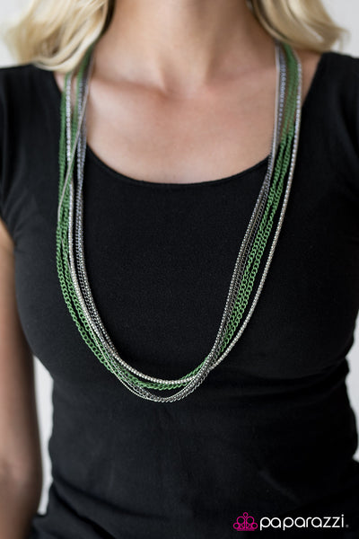 Brushed in a metallic finish, green chains collide with mismatched gunmetal and silver chains across the chest. Shimmery silver and gunmetal popcorn chains join the colorful layers, adding shimmery metallic texture to the spunky mixed palette. Features an adjustable clasp closure. Paparazzi Accessories