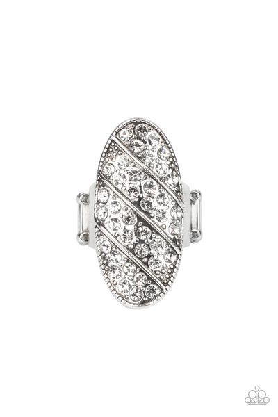 Rows of glassy white rhinestones slant across a stretched oval frame dotted in silver studs, creating a dramatic centerpiece atop the finger. Features a stretchy band for a flexible fit.