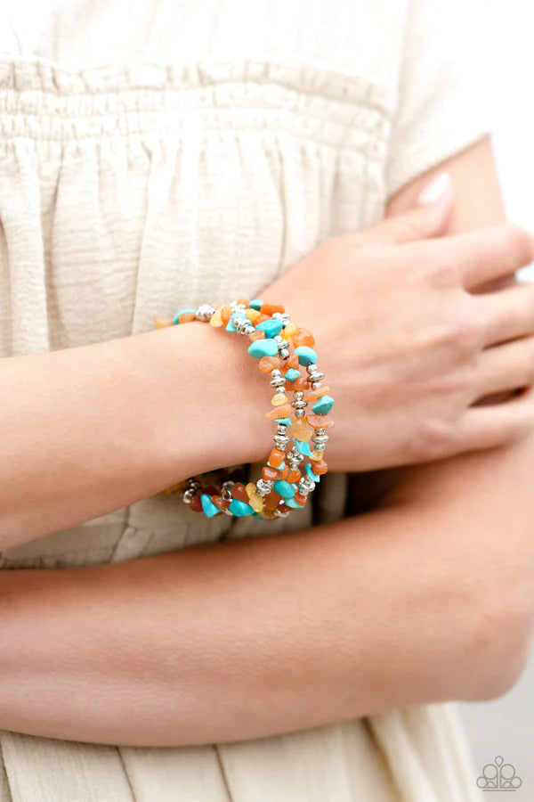 Featuring a chiseled finish, a mismatched collection of orange, turquoise, and yellow stones and shiny silver beads are threaded along a coiled wire, creating an earthy infinity wrap style bracelet. As the stone elements in this piece are natural, some color variation is normal.