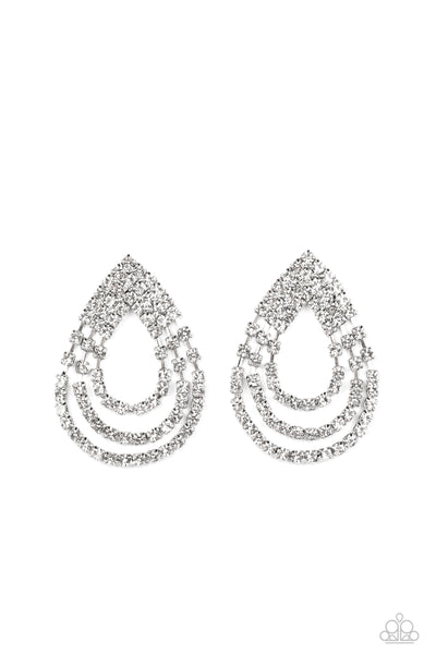 Loops of glassy white rhinestones ripple out from the bottom of a stationary triangular fitting that is dotted in glittery white rhinestones, resulting in a timeless teardrop chandelier. Earring attaches to a standard post fitting.