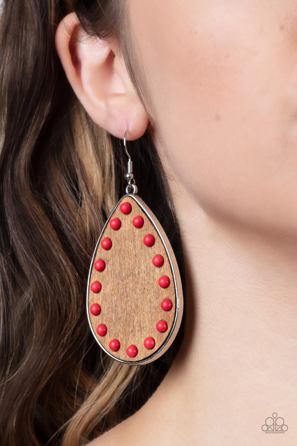 Dainty black stone beads border an earthy wooden teardrop frame that is encased in a sleek silver fitting, creating a whimsical woodsy lure. Earring attaches to a standard fishhook fitting.
