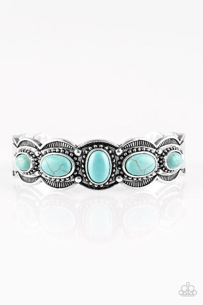 Refreshing turquoise stones are pressed down the center of a scalloped silver cuff radiating with studded textures for an artisan inspired look.