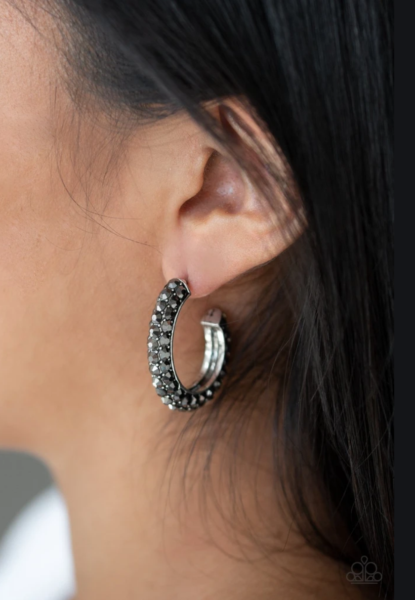 As if rolled in glitter, a shimmery gunmetal hoop is encrusted in row after row of sparkling white rhinestones for a show-stopping look. Earring attaches to a standard post fitting. Hoop measures 1" in diameter.