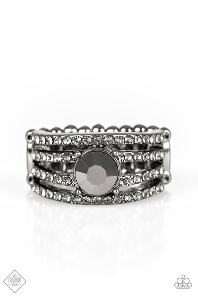 Row after row of smoky rhinestone encrusted bands race across the finger, creating shimmery layers. An over-sized hematite rhinestone is pressed into the center of the stacked bands for a statement-making finish. Features a stretchy band for a flexible fit.