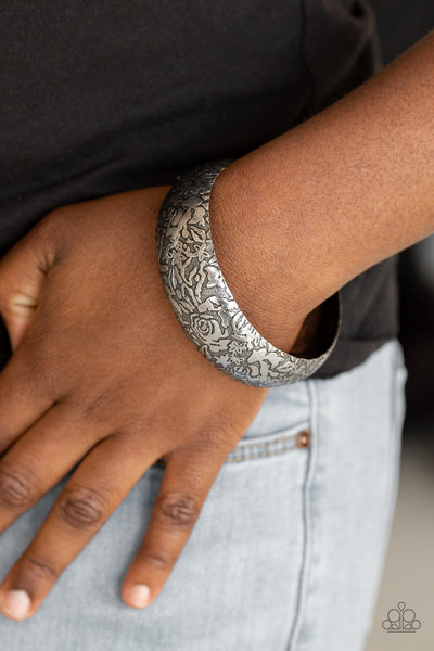Brushed in an antiqued finish, a rosy floral pattern is embossed across a thick brass bangle for a seasonal flair.
