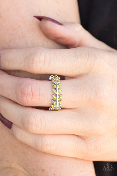 Encrusted in dainty green rhinestones, a leafy silver band arcs across the finger for a seasonal look. Features a dainty stretchy band.