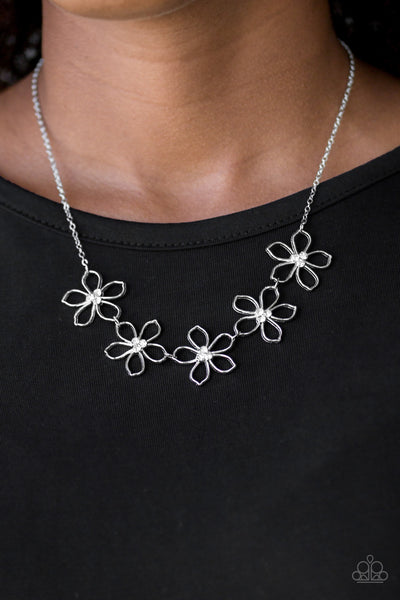Dotted with radiant white rhinestone centers, airy silver flowers link below the collar for a seasonal look. Features an adjustable clasp closure.