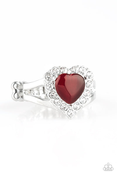 A heart-shaped red moonstone is pressed into the center of a shimmery silver frame radiating with glittery white rhinestones for a romantic look. Features a dainty stretchy band for a flexible fit.
