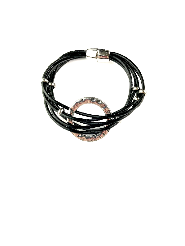Shiny red cords are threaded through dainty silver beads and a hammered silver hoop, creating rugged layers across the wrist. Features a magnetic clasp.