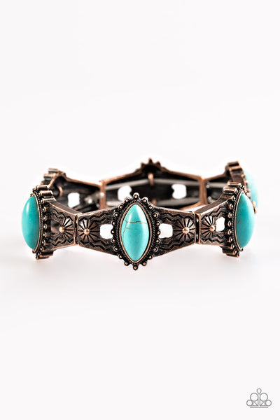 Ornate copper frames are threaded along an elastic stretchy band and linked around the wrist. Refreshing turquoise stones are pressed into the centers of the tribal inspired frames for a seasonal finish.