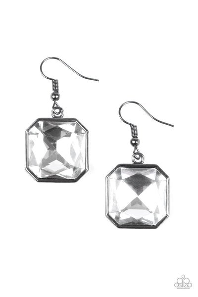 A faceted white gem is pressed into a glistening gunmetal frame for a dramatic look. Earring attaches to a standard fishhook fitting.