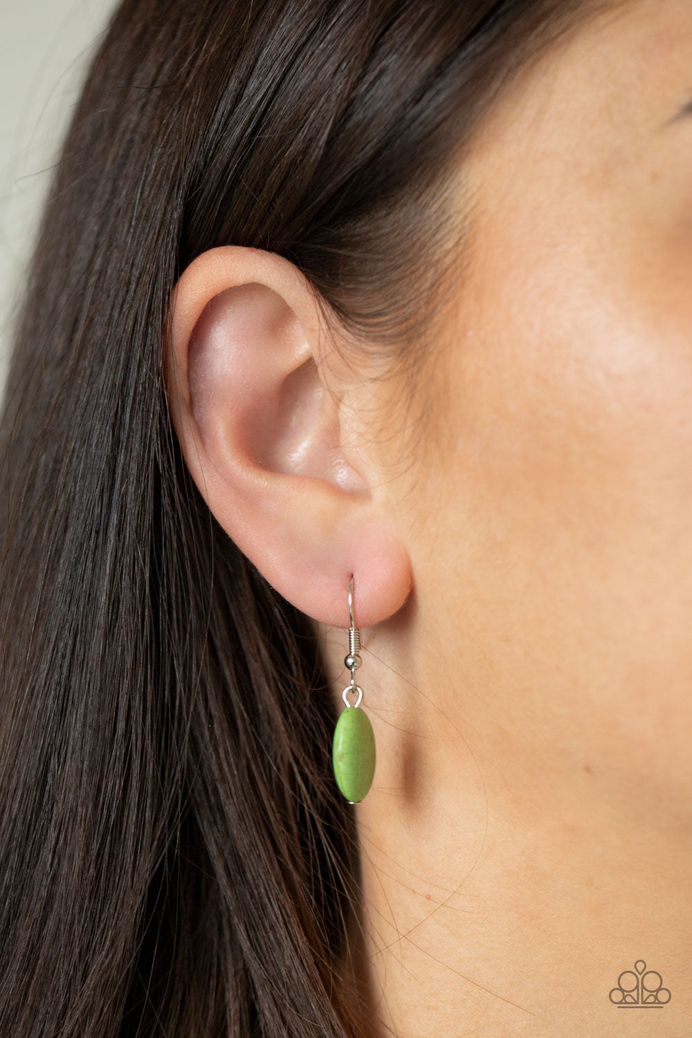 A set of oversized oval green stones, encased in hammered silver frames, are linked one upon the other, calling attention to their bold mood. A fringe of silver chain sways below the set on a lengthened silver chain adding a flirtatious flair. Features an adjustable clasp closure.