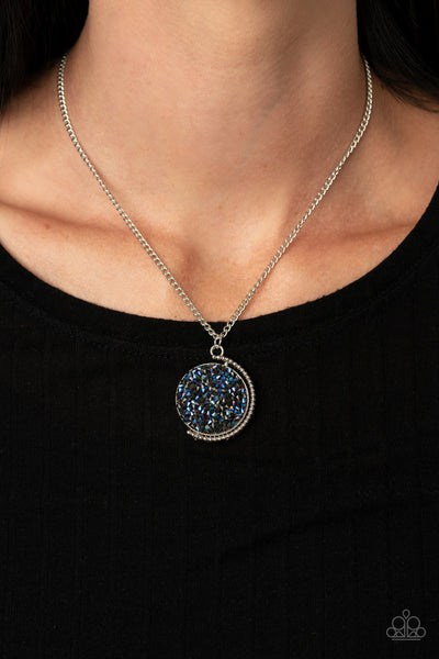 A smoldering collision of black and metallic blue rhinestones are encrusted across the front and back of a textured silver disc below the collar. Threaded along a dainty rod, the glittery pendant effortlessly spins on its axis inside a silver studded half-circle frame. Features an adjustable clasp closure.