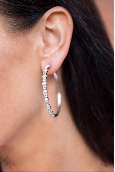 The front edge of a glistening silver hoop is decorated in a refined collection of tiny white pearls and glassy white rhinestones for a sophisticated finish. Earring attaches to a standard post fitting. Hoop measures approximately 2" in diameter. Sold as one pair of hoop earrings.