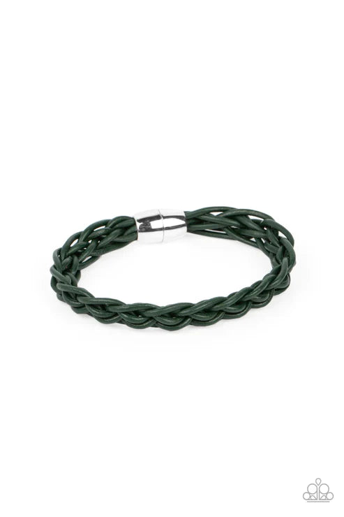 Leathery green cords intricately weave around the wrist, creating a rustic braid. Features a magnetic closure.