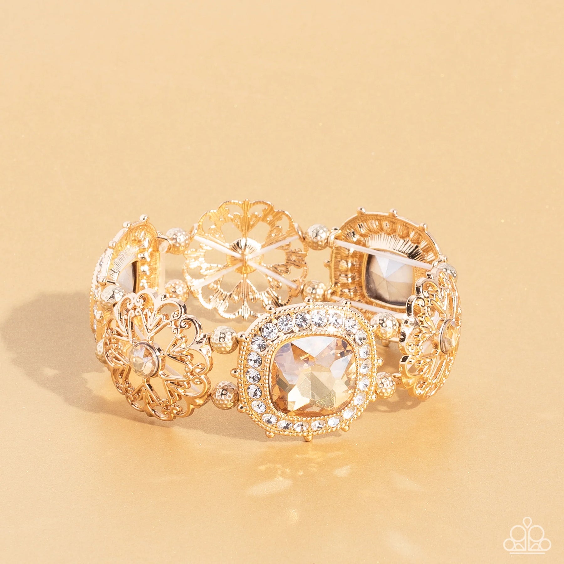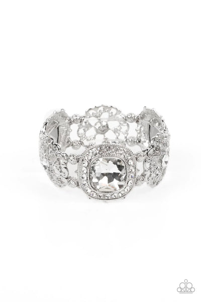 Oversized faceted white gems in dramatically rounded square cuts are wrapped in borders of classic white rhinestones, emitting a breathtaking sheen. Floral-inspired frames, dotted with solitaire white rhinestones, bloom in between the large rhinestones, adding airy accents to the bold design, as textured silver beads separate each frame as they're threaded along stretchy elastic bands.