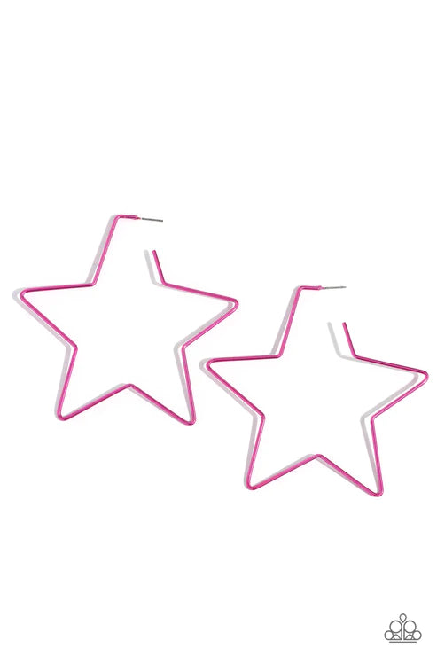 A thin, oversized pink metallic bar delicately folds into a star-shaped hoop, resulting in a stellar statement. Earring attaches to a standard post fitting.