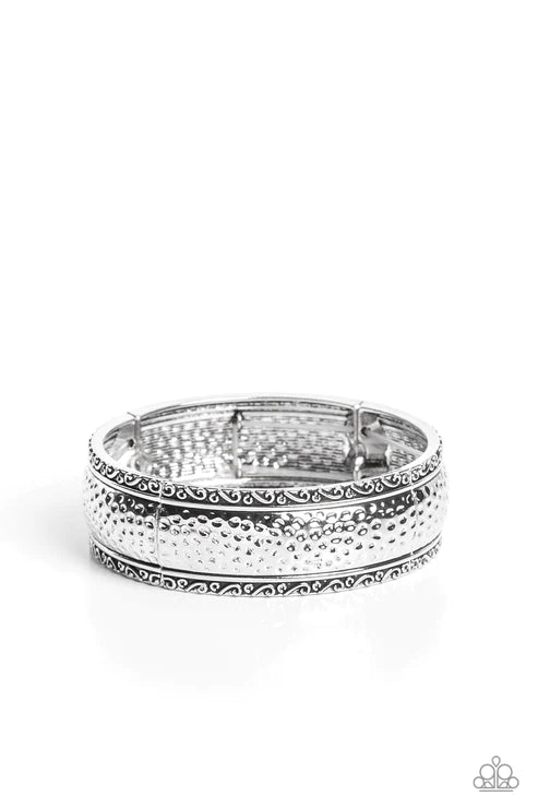 Curved frames of high-sheen silver curve around the wrist on elastic stretchy bands. Studs and ribbons of silver curl into a dainty filigree above and below its hammered center for a soft and dauntless combo.