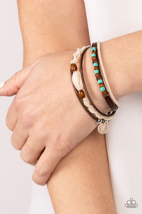 An assortment of colorful seed beads, white shells, and earthy wooden accents adorns mismatched strands of leather and colorful cording around the wrist for a summery vibe. Features an adjustable sliding knot closure.