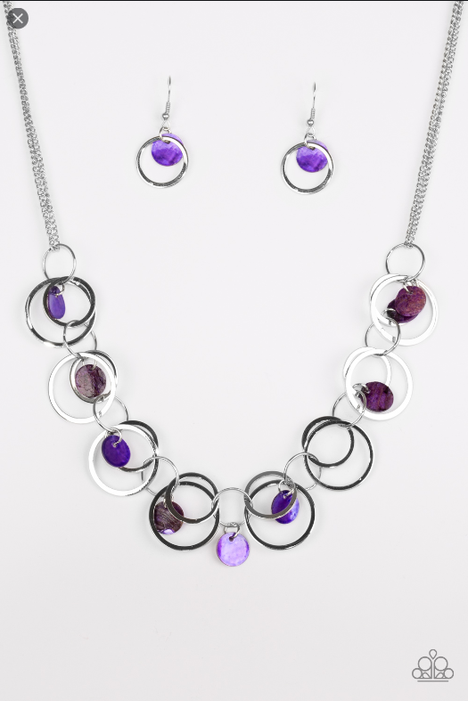 Bits of iridescent purple shell swing from the bottoms of mismatched silver hoops below the collar for a summery look. Features an adjustable clasp closure.