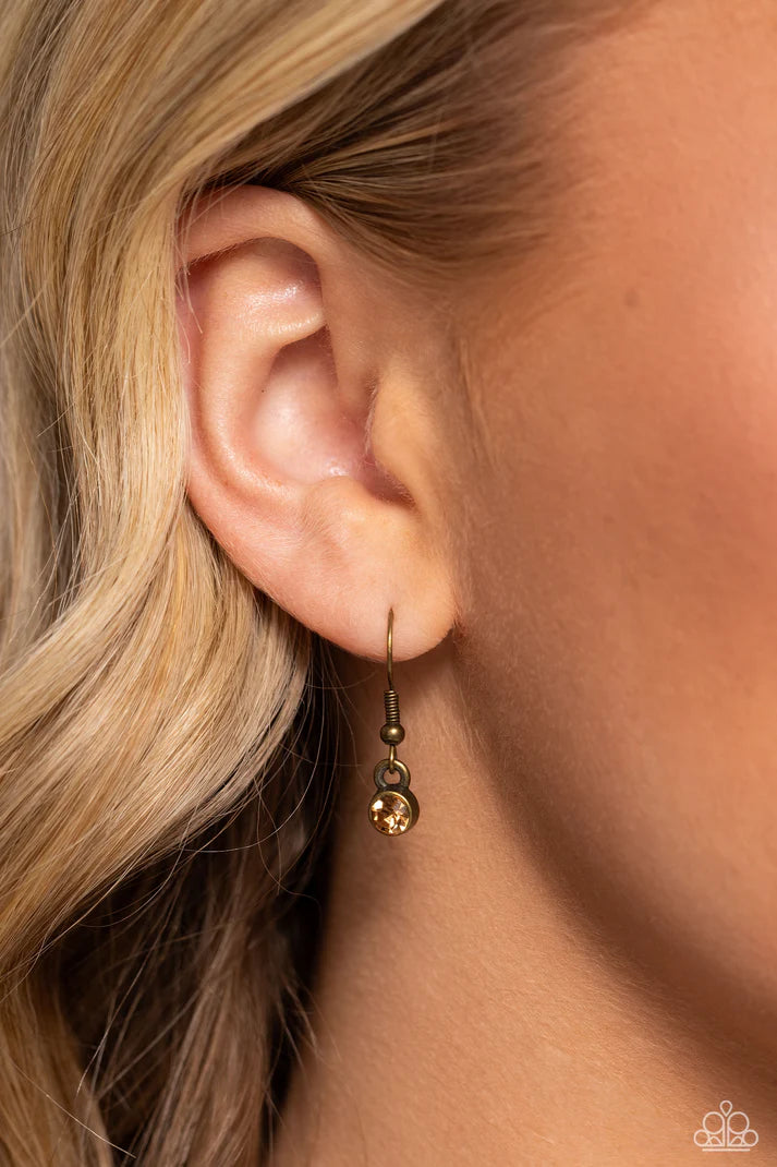 Half of a lifelike brass leaf frame is adorned in glittering topaz rhinestones as it hangs from the bottom of a lengthened brass chain, creating a simple seasonal sparkle. Features an adjustable clasp closure.