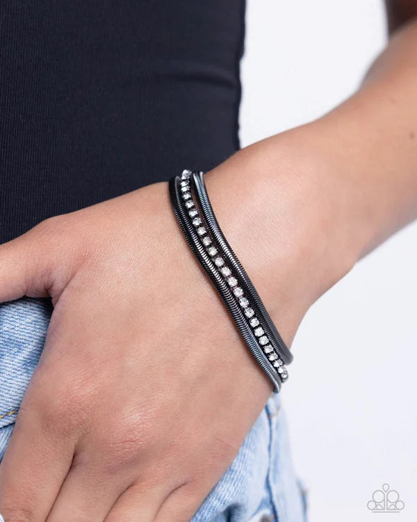 Two strands of gunmetal herringbone chain combine with a strand of white rhinestones in gunmetal square fittings for a sleek, industrial display around the wrist. Features an adjustable clasp closure.