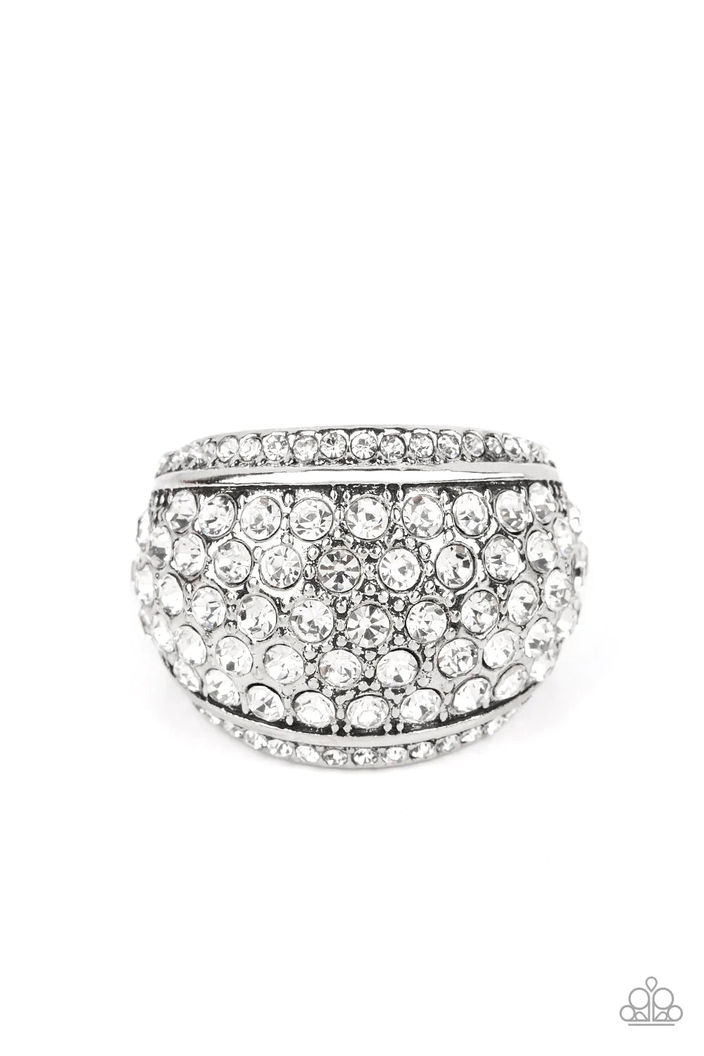 A thick band of silver arcs across the top of the finger, creating an exaggerated rounded frame. Countless tiny white rhinestones scatter across the surface, as straight lines of even more rhinestones line the outer edges in a blinding finish. Features a stretchy band for a flexible fit.