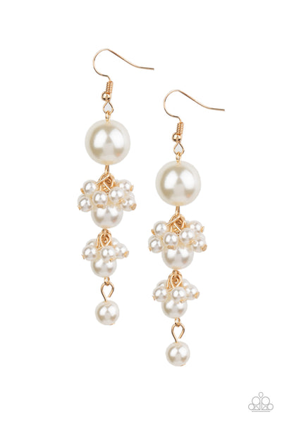 Clusters of dainty white pearls trickle along a glistening gold chain that delicately links together a bubbly strand of pearls. The classic pearls gradually decrease in size, creating a timelessly tasseled display. Earring attaches to a standard fishhook fitting.