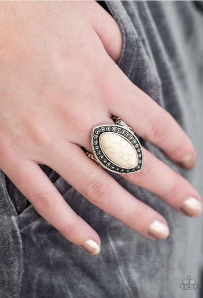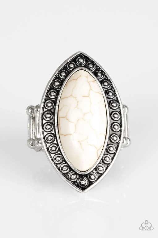 Chiseled into a tranquil marquise-shape, an earthy white stone is pressed into a silver frame radiating with studded textures.