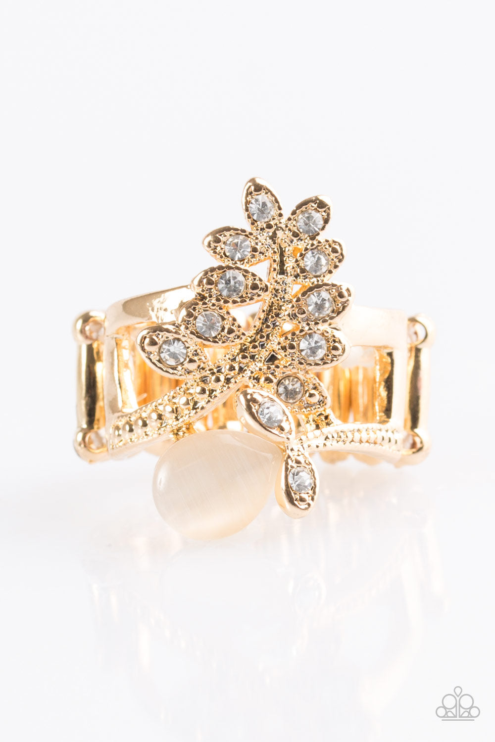 Encrusted in white rhinestones, leafy gold bars wrap across the finger, creating a seasonal band. A luminescent teardrop moonstone adorns the band for a whimsical finish. Features a stretchy band for a flexible fit.