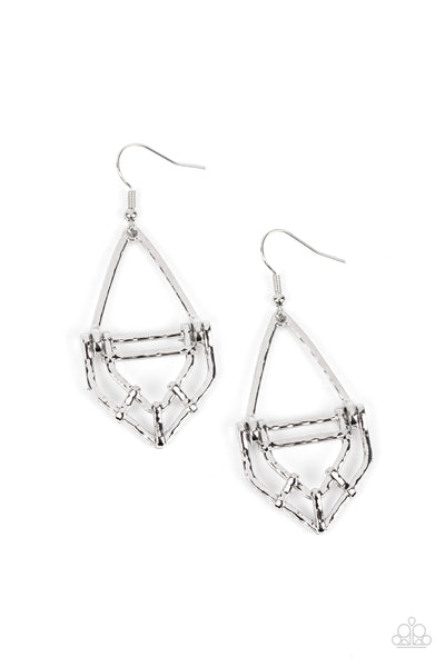 Brushed in a shiny finish, hammered silver bars and silver fittings attach to an edgy geometric lure for a versatile vibe. Earring attaches to a standard fishhook fitting.