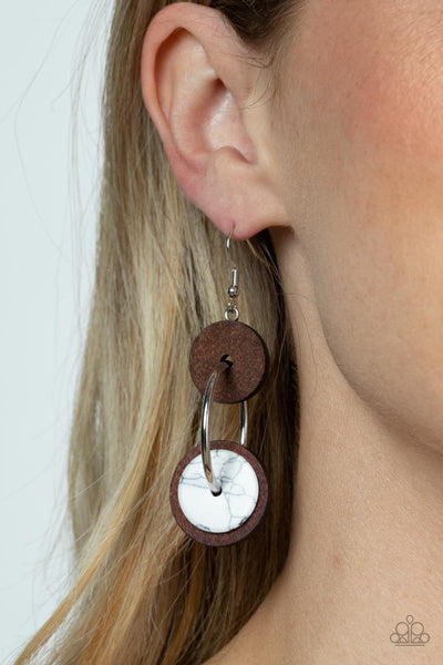 An earthy collection of brown wood and turquoise stone discs are threaded along a silver hoop, linking into a trendy lure for an artisan inspired fashion. Earring attaches to a standard fishhook fitting.