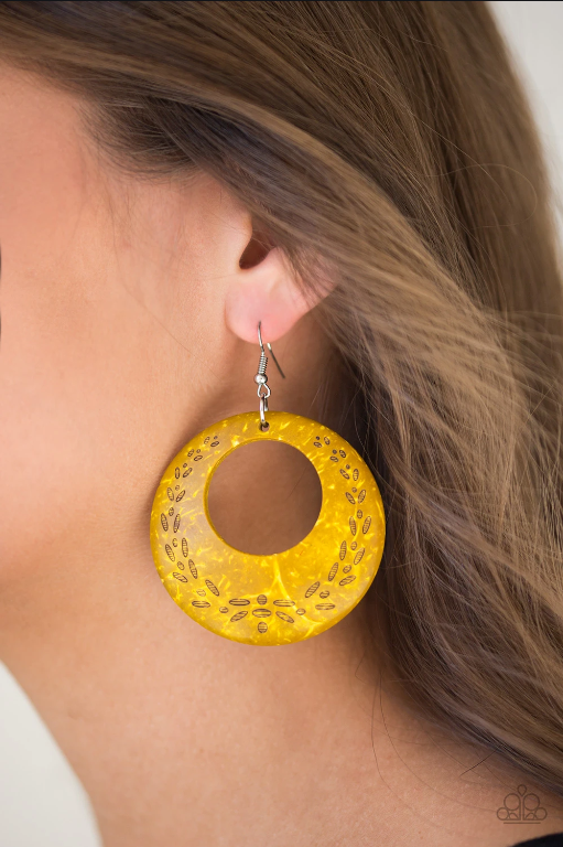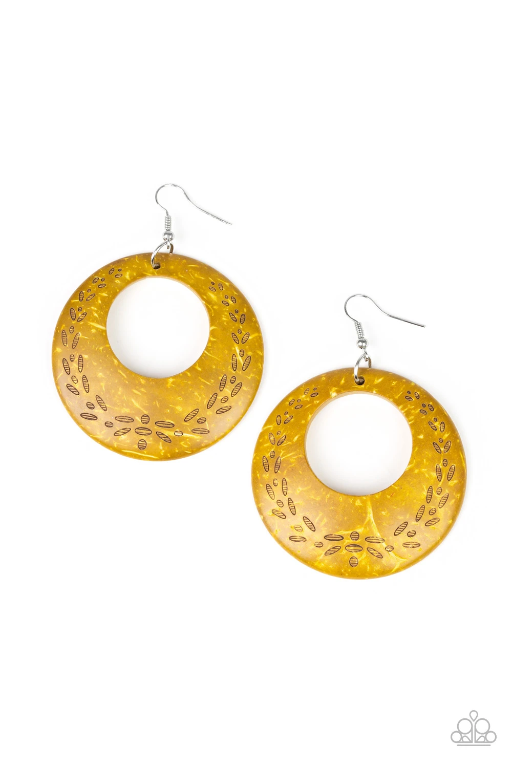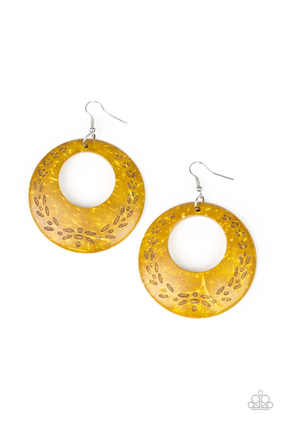 Etched in a leafy pattern, a distressed yellow wooden frame swings from the ear for a summery look. Earring attaches to a standard fishhook fitting.