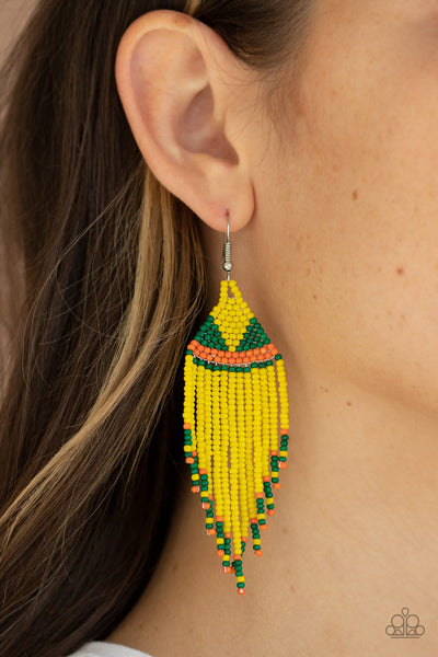 Strands of yellow, green, and orange seed beads colorfully weave into a vivaciously beaded fringe. Earring attaches to a standard fishhook fitting.