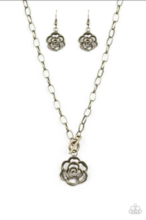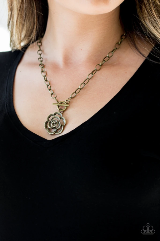 Brushed in an antiqued shimmer, an airy rosebud pendant swings from the bottom of a glistening brass chain below the collar for a vintage inspired look. Features a toggle closure.