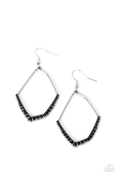 A shiny silver bar asymmetrically bends into an abstract geometric shape. Separated by silver studs, a smoldering border of black rhinestones gradually increases in size along the bottom of the frame for an edgy finish. Earring attaches to a standard fishhook fitting.