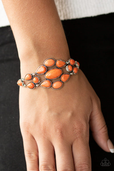 Featuring studded silver frames, a collection of orange teardrop, oval, and round stone beads connect across the wrist, creating a bold floral frame atop the wrist. Features an adjustable clasp closure.